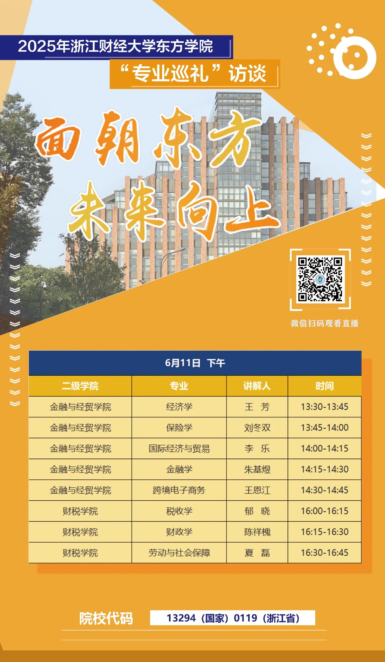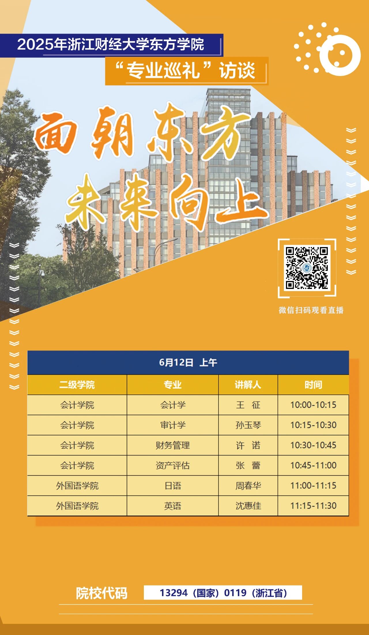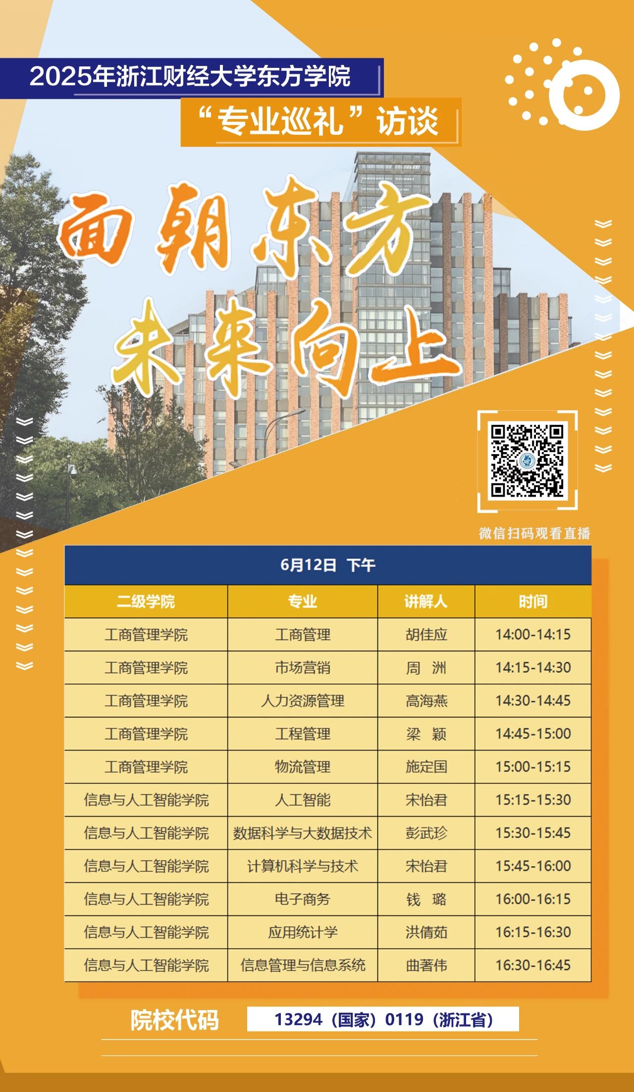 各位考生、家长们:6 月 11 日-12 日,我院将开展线上 “专业巡礼” 宣讲。学院 33 个招生专业全面解读,专业教师将详细介绍专业情况、培养方向、就业前景等。想精准锚定理想专业?锁定这两天的线上宣讲,让专业解读为志愿填报点亮方向!愿每一位考生都能在东方学院找到热爱的领域,奔赴属于自己的璀璨前程,我们在这里等你逐梦而来!